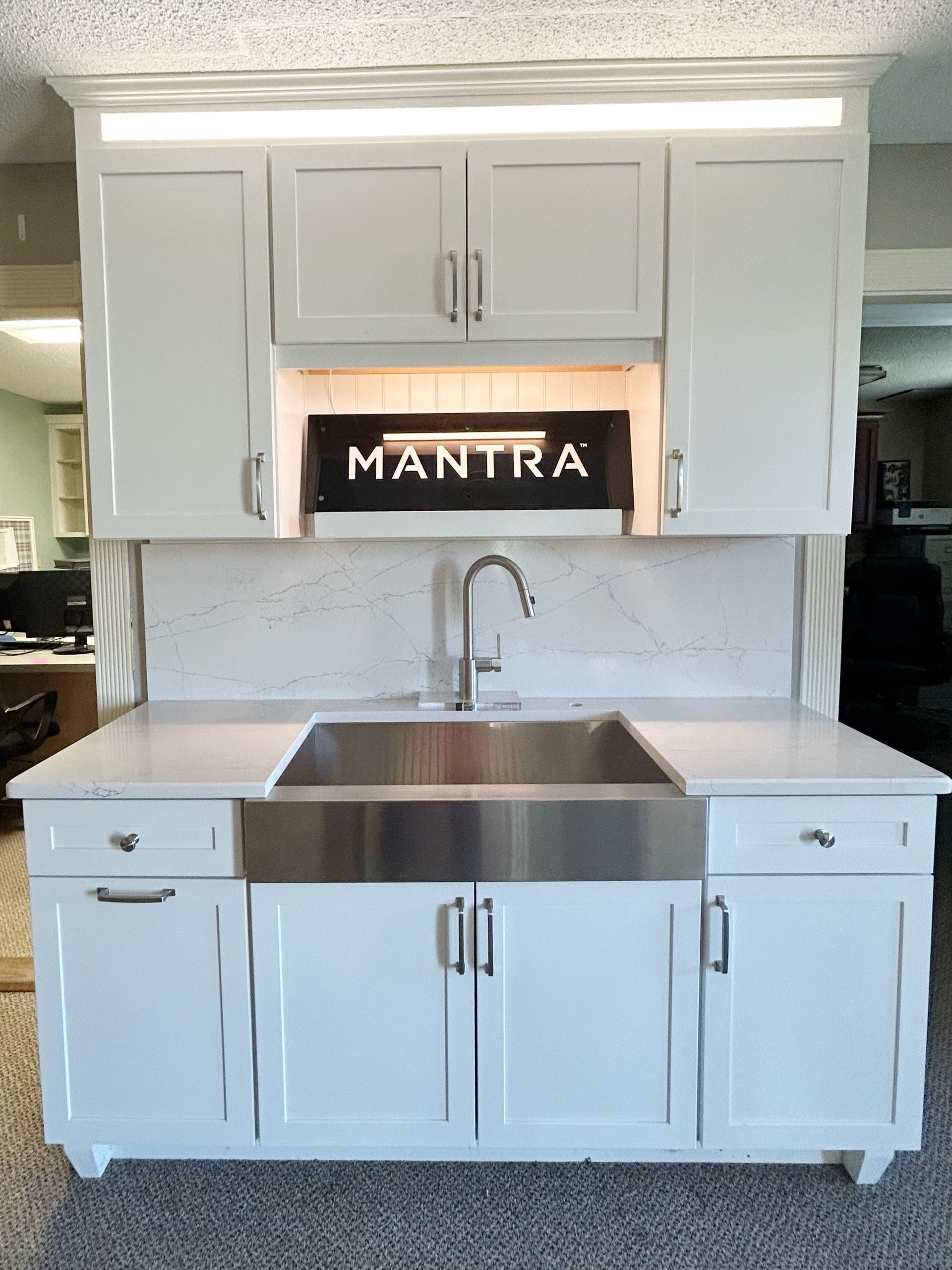 Explore this beautiful kitchen model in our showeroom featuring Mantra Omni Snow Cabinets, Calcatta Montage Quartz countertops and Kohler Apron Front sink in a stainless steel finish! Highlighting the space is the above and under cabinet lighting, which enhances both the aesthetics and functionality of the kitchen. Come visit our showroom today!