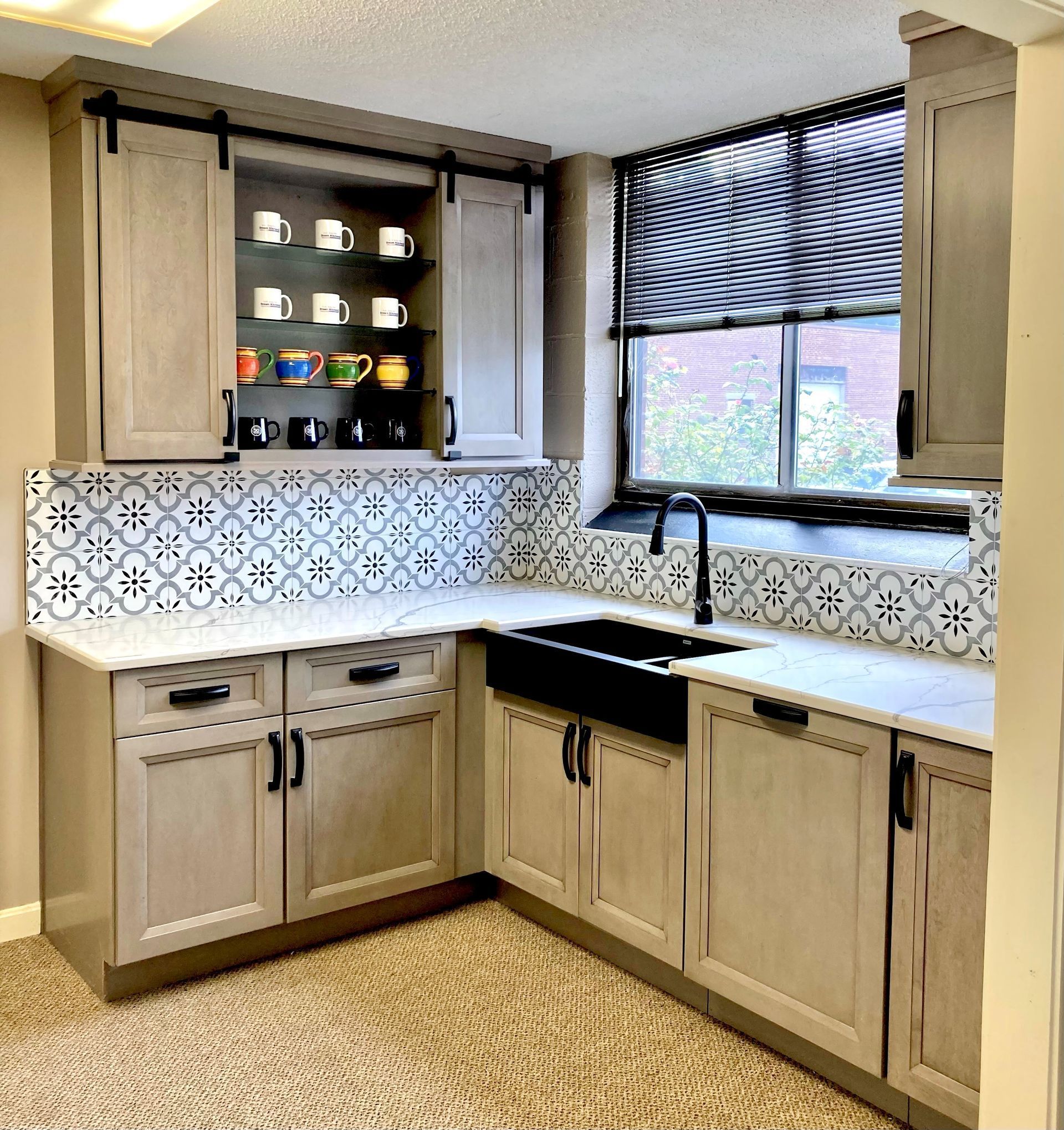 Check out this stunning kitchen model in our showroom feauturing Fabuwood cabinets in the Onyx Horizon finish with unique barn door cabinets. Can't forget the countertop, made of Raphael Quartz Venato Classic as well as our Blanco Siligrant Apron Front sink in the Coal Black finish. Come visit our showroom today!