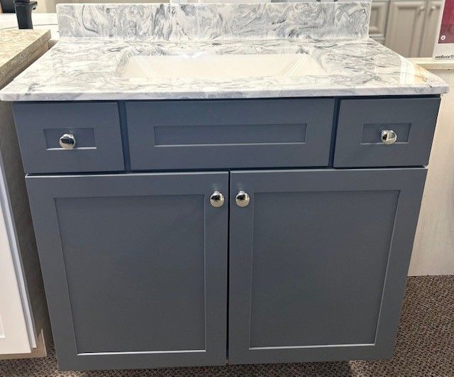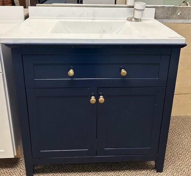 Check out this vanity we have in our showroom. This is a Contour Swanstone "Carrara" vanity top paired with a 36" Chatam Hale Blue Vanity. Come visit us today!